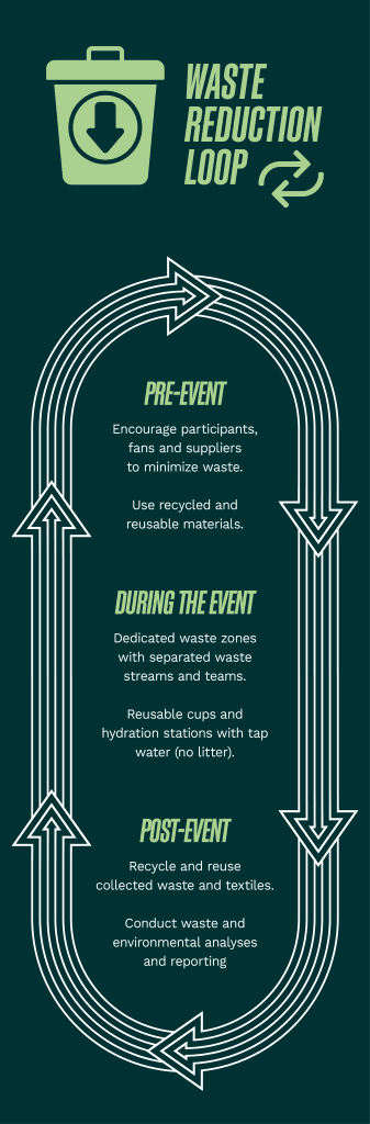 We minimise waste through clearly marked recycling zones and cleaning and plogging actions. Reusable materials play a key role: T-shirts from recycled plastics, reusable bottles, low-impact medals, ... Suppliers and fans commit to our sustainability charter.